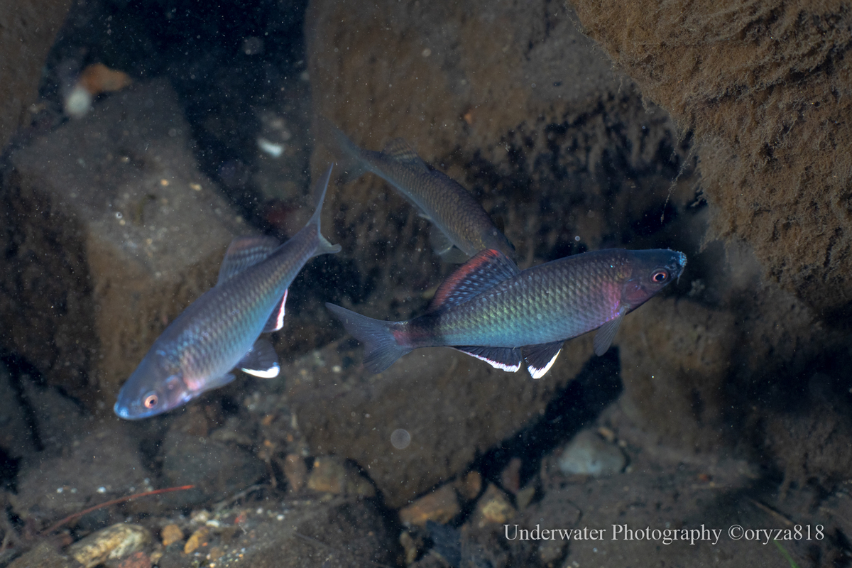 タナゴの仲間は概して警戒心が強く臆病な種が多いですが、セボシタビラの警戒心はそのタナゴ中でもひと回り以上に強く、なかなか障害物の陰から出てこず撮影には手こずりました。それでも1時間以上慣らしていくと明るいところにも出てきて目の前で採餌もするようにまでなりました。